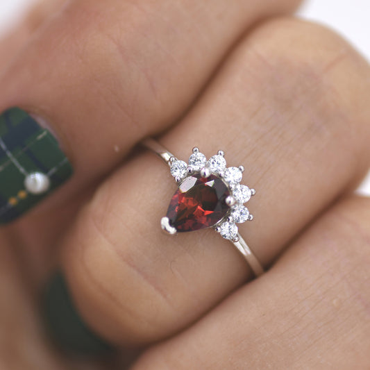 Genuine Pear Cut Garnet Crown Ring in Sterling Silver, Natural Garnet Crystal Ring, Vintage Inspired Design, US 5 - 8