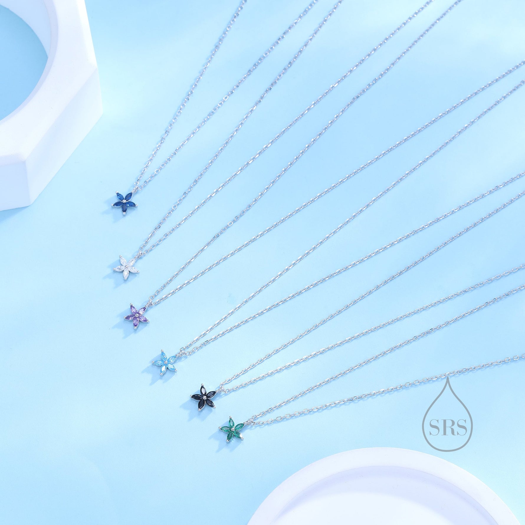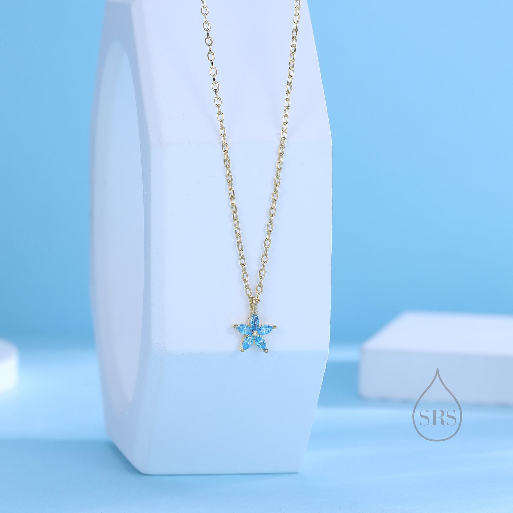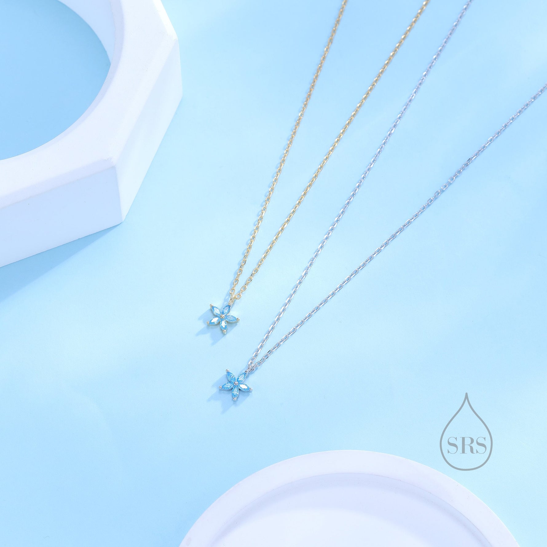 Tiny Aquamarine Blue CZ Flower Necklace in Sterling Silver, Silver or Gold, CZ Flower Necklace, CZ Cluster Floral Necklace