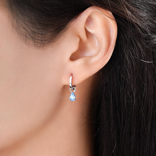 Sterling Silver Aquamarine Blue Pear Cut CZ Huggie Hoop Earrings, Droplet Dangle Hoop Earrings, Interchangeable Charm, March Birthstone