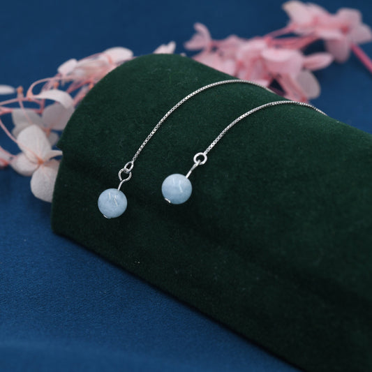 Natural Aquarmarine Beads Threader Earrings in Sterling Silver, Genuine Aquamarine Crystal Ear Threaders