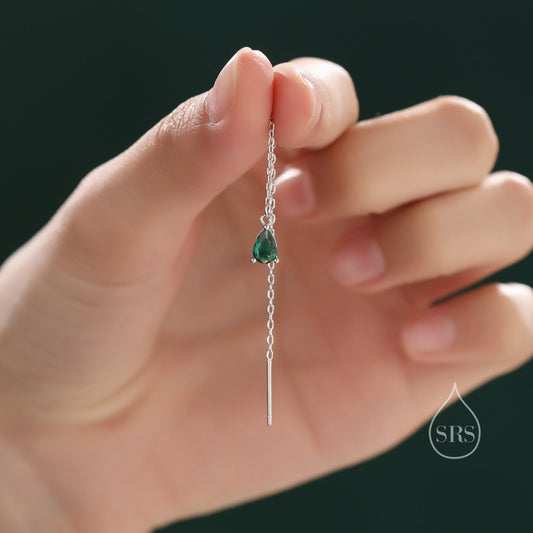Emerald Green Droplet CZ Threader Earrings in Sterling Silver, Silver or Gold, Tiny Pear Shape Crystal Ear Threaders, Prong Set CZ Earring