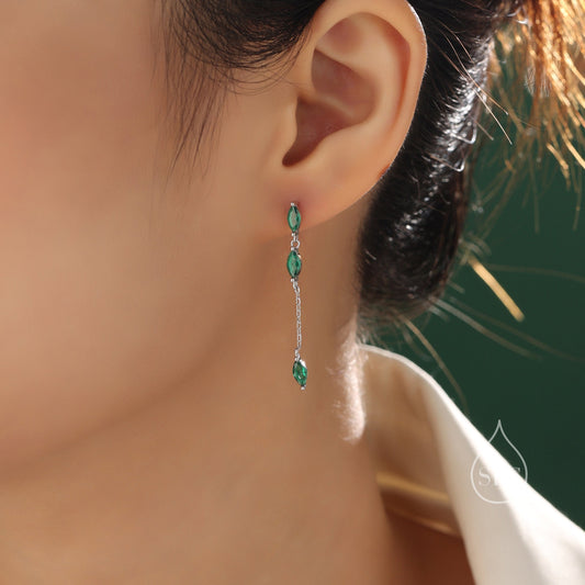 Asymmetric Marquise Emerald Green CZ Dangle Drop Stud Earrings in Sterling Silver, Marquise CZ Leave Earrings, Tree Branch Nature Inspired