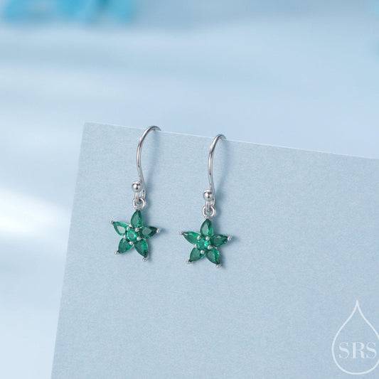 Sterling Silver Emerald Green CZ Flower Drop Dangle Earrings, Dainty Dangle Forget Me Not Flower Drop Earrings, Silver CZ Hook Earrings