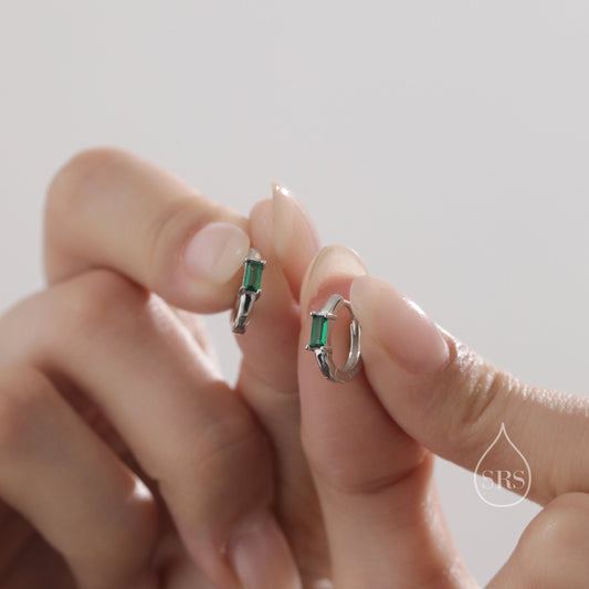 Emerald Green Single Baguette Cut CZ Huggie Hoop in Sterling Silver, Silver or Gold, Minimalist Simple Green Hoop Earrings