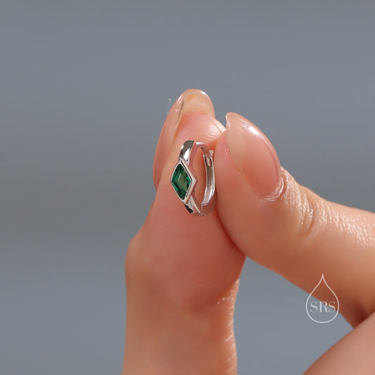 Very Tiny Rhombus Emerald Green CZ Huggie Hoop in Sterling Silver, Silver or Gold, Minimalist Simple Kite Shape CZ Hoop Earrings