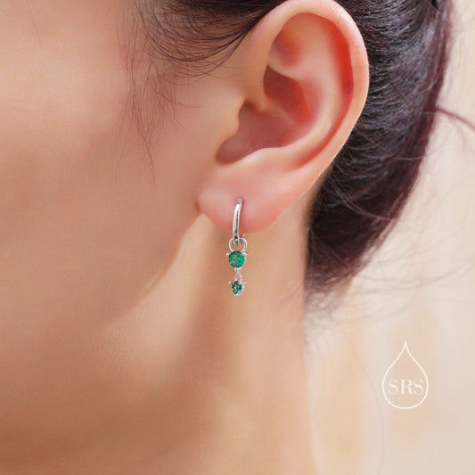 Double Emerald Green CZ Huggie Hoop Earrings in Sterling Silver, Silver or Gold, Detachable Charm Hoops, Geometric Hoop Earrings