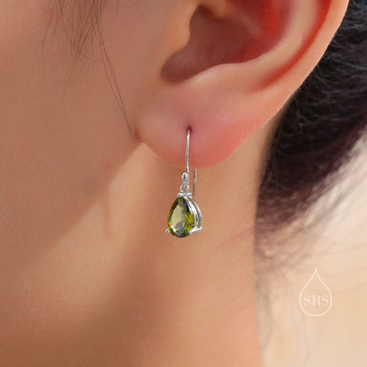 Sterling Silver Olive Green CZ Droplet Drop Earrings in Sterling Silver, Silver or Gold, Pear Shape Cubic Zirconia Hook Earrings