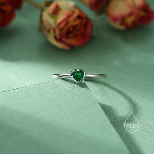 Sterling Silver Very Tiny Emerald Green CZ Heart Ring, Adjustable Size, Green Heart Ring, Tiny Heart Ring, Tiny Green CZ Heart Ring