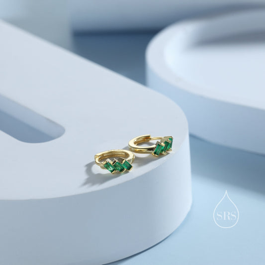 Emerald Green Baguette CZ Cluster Huggie Hoop in Sterling Silver, Silver or Gold, Geometric Hoop Earrings