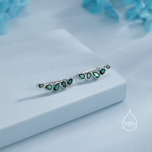 Emerald Green Droplet CZ Cluster Crawler Earrings in Sterling Silver, Silver or Gold, Pear CZ Cluster Crawler, Cluster Earrings