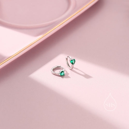 Delicate Emerald Green CZ Heart Huggie Hoop in Sterling Silver, Silver or Gold Green Hoops, 8mm Inner Diameter, Stacking Earrings,