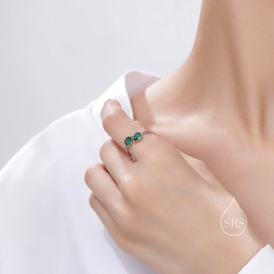 Toi et Moi Pear Cut Emerald Green CZ Open Ring in Sterling Silver, Adjustable Size, Green Cubic Zirconia Double Stone Ring, Pear Cut Ring