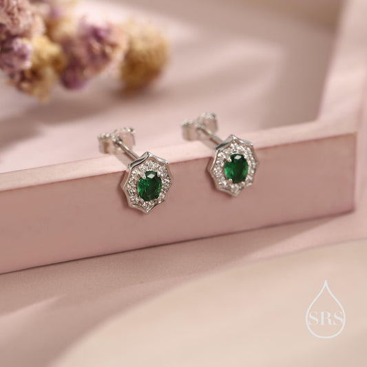 Vintage Inspired Emerald Green CZ Halo Stud Earrings in Sterling Silver, Silver or Gold, Tiny CZ Stud Earrings, May Birthstone
