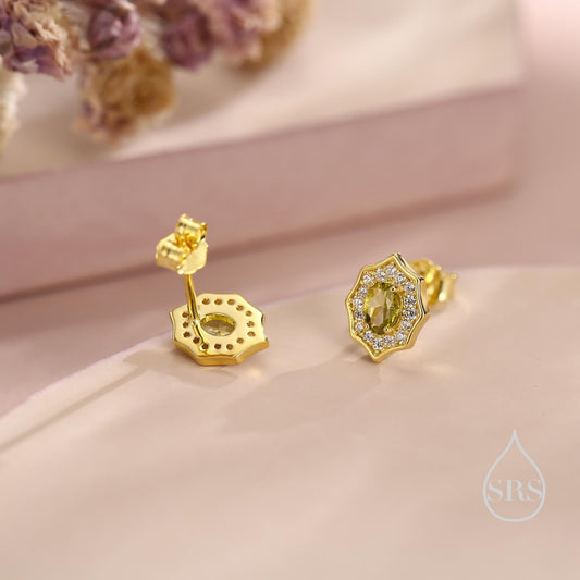 Vintage Inspired Olive Green CZ Halo Stud Earrings in Sterling Silver, Silver or Gold, Tiny CZ Stud Earrings, May Birthstone