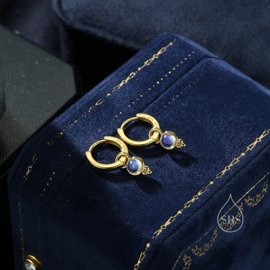 Vintage Inspired Moonstone Charm Hoop Earrings, Dotted Lab Moonstone Dangle Hoop Earrings, Silver or Gold, Detachable and Interchangeable