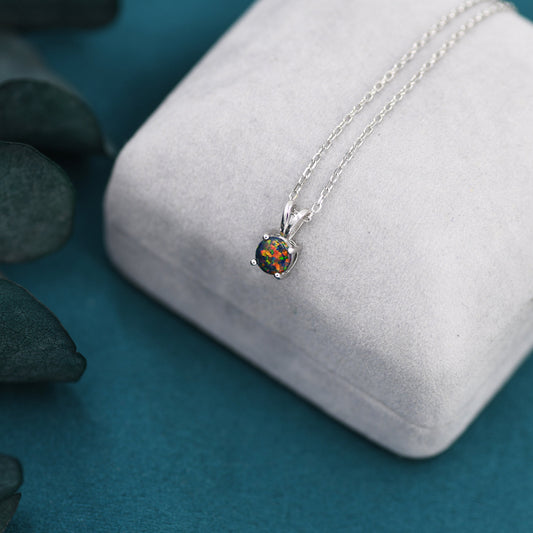 Tiny Black Opal Pendant Necklace in Sterling Silver, 5mm Lab Opal Necklace, Single Opal Necklace, Fire Opal Necklace