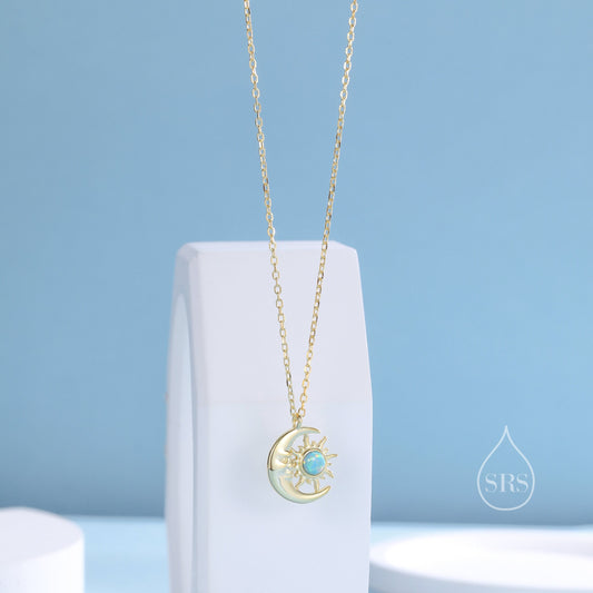 Aqua Green Opal Moon and Star Pendant Necklace in Sterling Silver, Silver or Gold, Man in the Moon, Lab Opal Starburst Necklace