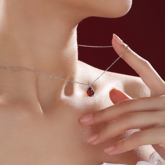 Genuine Garnet Pear Necklace in Sterling Silver, Droplet Cabochon Natural Garnet Pendant Necklace