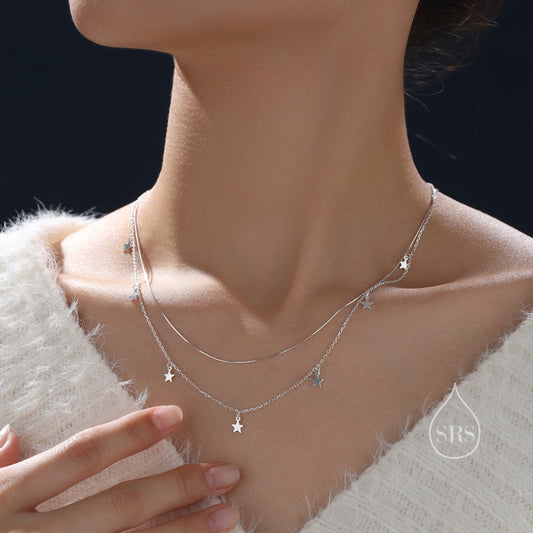 Double Layer Tiny Star Charm Necklace in Sterling Silver, Star Motif Two Layer Necklace, Adjustable Length, Extra Small Pendant