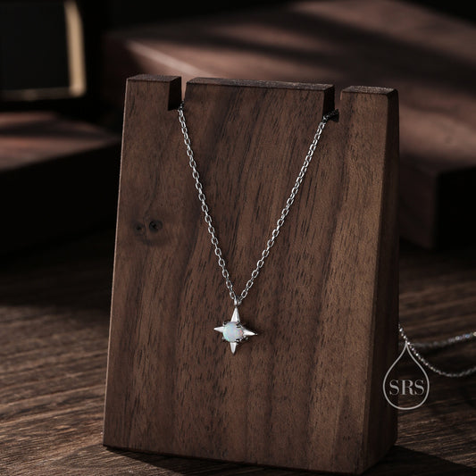 Tiny White Opal Star Pendant Necklace in Sterling Silver, Silver or Gold, Aurora Four Point Star Necklace, Lab Opal Star Necklace, Starburst