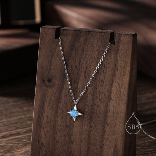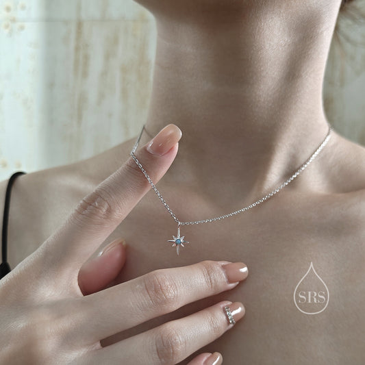 Tiny North Star Pendant Necklace in Sterling Silver with Blue Opal, Silver or Gold or Rose Gold, Starburst Necklace, Tiny Opal Star Necklace