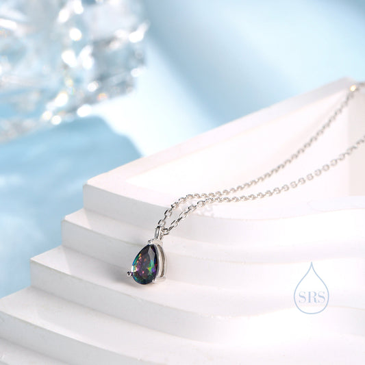 Mystic Black Droplet CZ Pendant Necklace in Sterling Silver, Pear Cut CZ Necklace, Aurora, Mystic Topaz