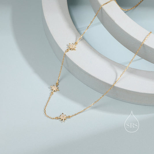 Starburst CZ Necklace in Sterling Silver, Silver or Gold or Rose Gold, Three Star Necklace, North Star Necklace, Sunburst Necklace, Star