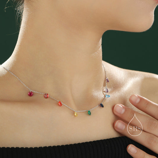 Rainbow Spectrum CZ Dangle Necklace in Sterling Silver, Silver or Gold, Satellite Crystal Necklace, Solid Silver Motif Necklace