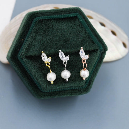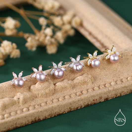 Genuine Freshwater Pearl with Marquise CZ Stud Earrings in Sterling Silver, Available in Three Pearl Colours, Delicate Pearl and CZ Earrings