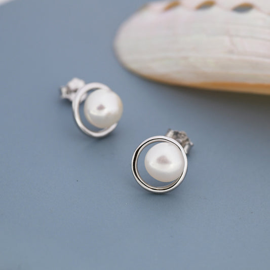 Genuine Freshwater Pearl and Circle Stud Earrings in Sterling Silver, Delicate Keshi Pearl Halo Earrings, Genuine Freshwater Pearls.