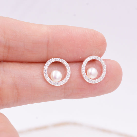 Pave Circle with Pearls Stud Earrings in Sterling Silver, CZ Pave, Genuine Freshwater Pearls