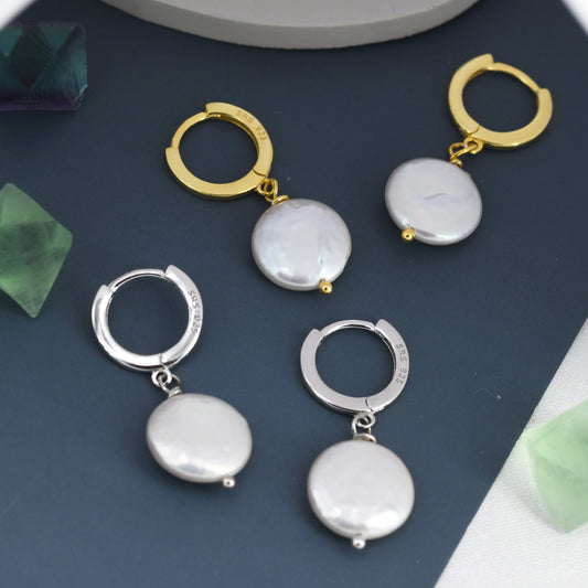 Coin Baroque Pearl Huggie Hoop Earrings in Sterling Silver, Simple Circle Disk Dangle Earrings, Gold and Silver, Natural Freshwater Pearl