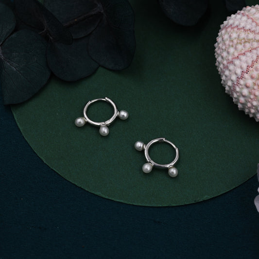 Three Pearl Huggie Hoop Earrings in Sterling Silver, Triple Pearl Hoop Earrings