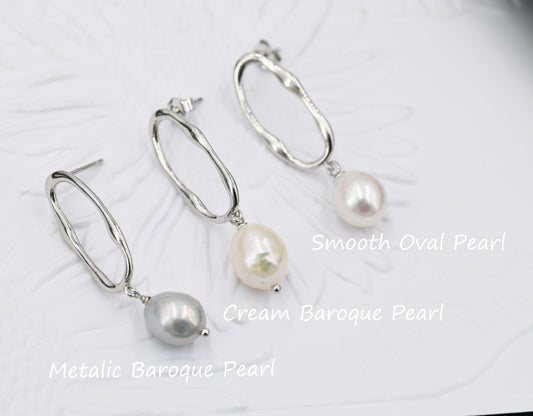 Sterling Silver Irregular Hoop Drop Stud Earrings with Pearls, Available in Three Pearl Choices, Genuine Freshwater Pearls