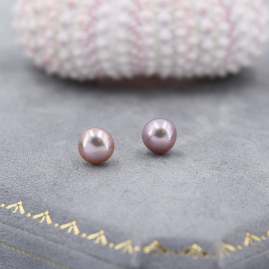 Genuine Purple Pink Pearl Stud Earrings in Sterling Silver, 5mm - 8mm, Small Pearl Stud and Large Pearl Stud, Silver pearl Earrings,