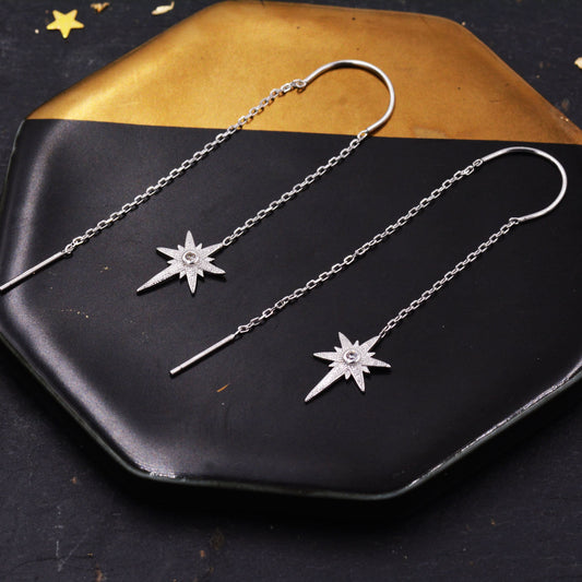 Beautiful Starburst Star Ear Threader Earrings, Silver, Gold or Rose Gold, Ear Wire in Sterling Silver, U shaped Dangle Threaders
