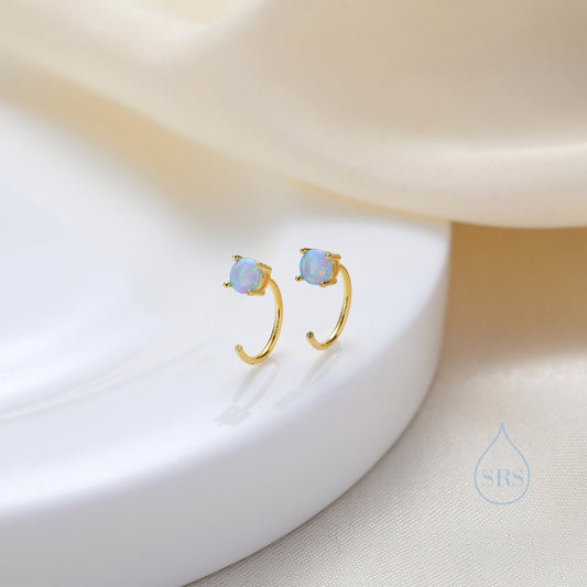 Blue Opal Huggie Hoop Earrings in Sterling Silver, Tiny Opal Open Hoop Earrings, Opal Pull Through Threaders, Half Hoops, C Shape Opal Hoops