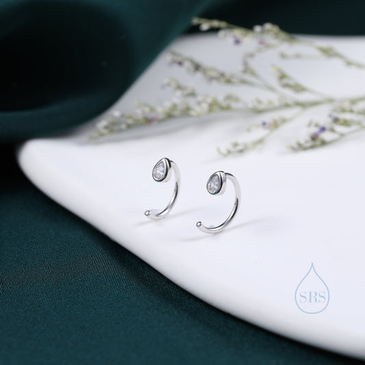 CZ Droplet Huggie Hoop Earrings in Sterling Silver, Tiny CZ Pear Cut Open Hoops, Pull Through Threaders, Half Hoops, C Shape