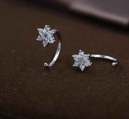 Clear CZ Flower Huggie Hoop Earrings in Sterling Silver, Tiny CZ Cluster Open Hoops, Pull Through Threaders, Half Hoops