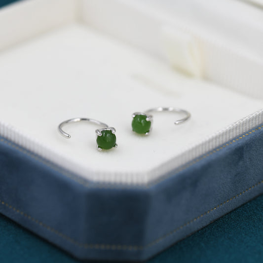 Genuine Jade Crystal Huggie Hoop Earrings in Sterling Silver, 4mm Natural Jade Open Hoops, Pull Through Threaders, Half Hoops, C Shape Hoops