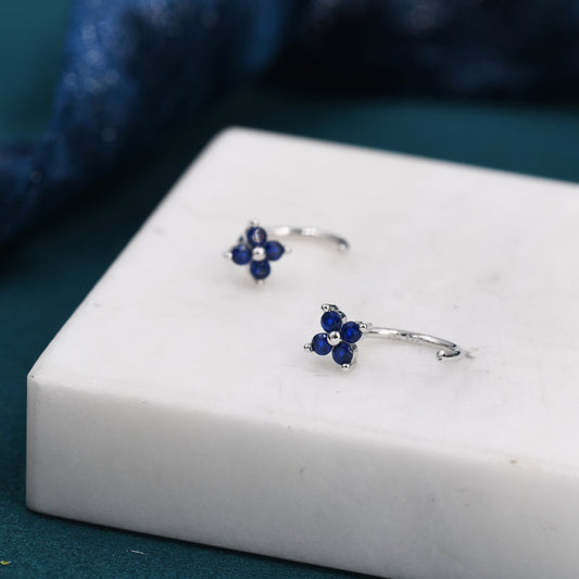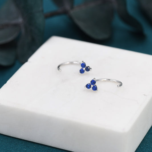 Sapphire Blue CZ Flower Huggie Hoop Earrings in Sterling Silver, Tiny Blue CZ Trio Open Hoops, Pull Through Threaders, Half Hoops, C Shape