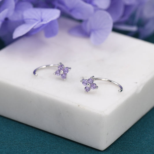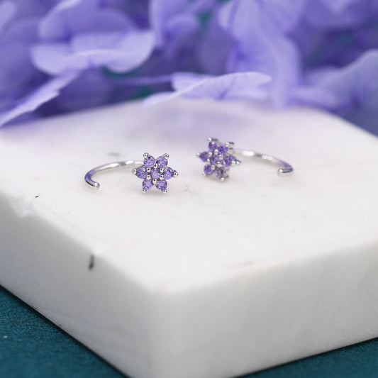 Amethyst Purple Flower Huggie Hoop Earrings in Sterling Silver, Tiny CZ Cluster Open Hoops, Pull Through Threaders, Half Hoops
