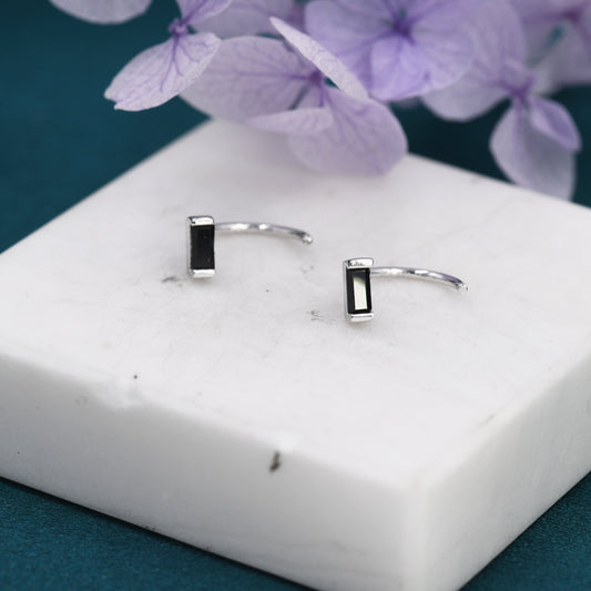 Black Baguette Cut CZ Huggie Hoop Earrings in Sterling Silver, Silver or Gold, Open Hoops, Pull-Through Threader Earrings,