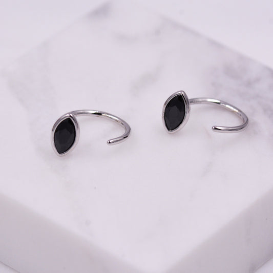 Black Spinel Crystal Marquise Huggie Hoop Threader Earrings in Sterling Silver, Gold or Silver, Pull Through Open Hoop Earrings