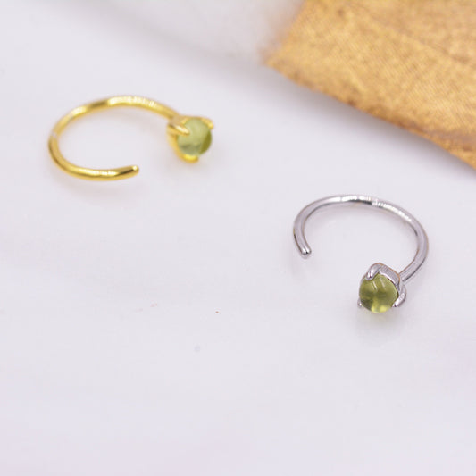 Natural Peridot Huggie Hoop Threader Earrings in Sterling Silver, 3mm Three Prong, Gold or Silver, Pull Through Open Hoops