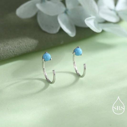 Natural Turquoise Huggie Hoop Threader Earrings in Sterling Silver, 3mm Three Prong Set, Gold or Silver, Pull Through Open Hoops
