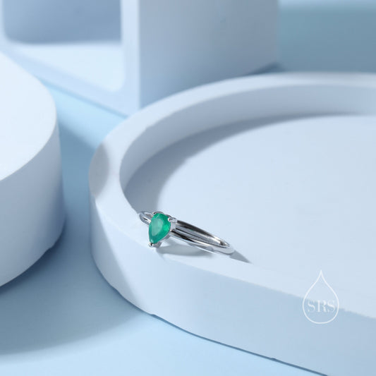 Natural Green Onyx Droplet Ring in Sterling Silver, 4x6mm, Prong Set, Adjustable Size, Green Chalcedony Ring