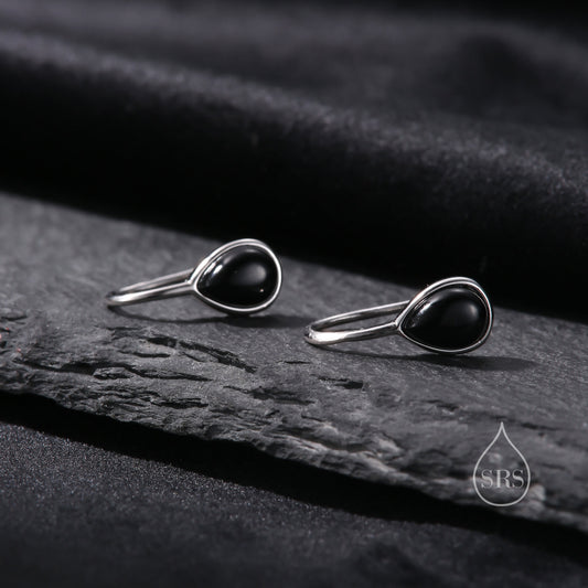 Genuine Black Onyx Pear Cut Drop Hook Earrings in Sterling Silver, Delicate Natural Black Onyx Earrings, Pear Droplet Black Onyx Earrings