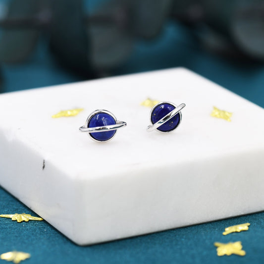 Genuine Blue Lapis Lazuli Planet Stud Earrings in Sterling Silver, Blue Lapis Planet Earrings, Blue Saturn Earrings