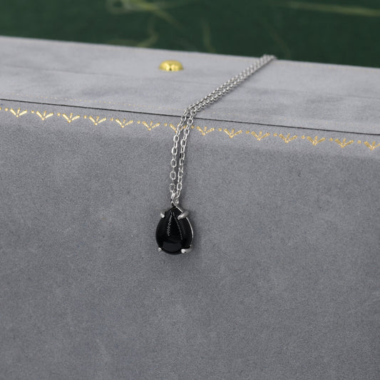 Genuine Black Onyx Pear Necklace in Sterling Silver, Droplet Cabochon Natural Black Onyx Necklace
